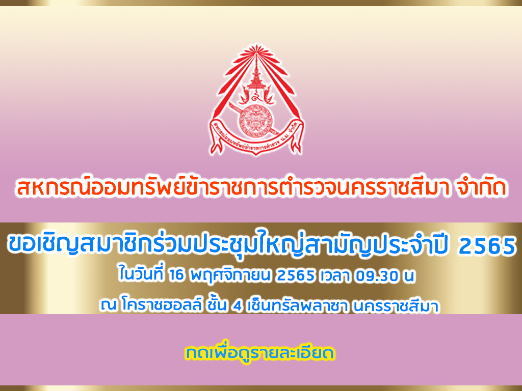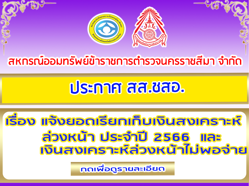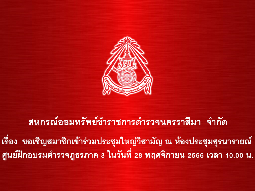 ประกาศสหกรณ์ฯ ขอเชิญสมาชิกเข้าร่วมประชุมใหญ่วิสามัญ ณ ห้องประชุมสุรนารายณ์ ศูนย์ฝึกอบรมตำรวจภูธรภาค 3 ในวันที่ 28 พฤศจิกายน 2566 เวลา 10.00 น. (คลิก) Posted on 23 พฤศจิกายน 202327 พฤศจิกายน 2023 by koratpolice koratpolice 23 พ.ย. Continue reading →